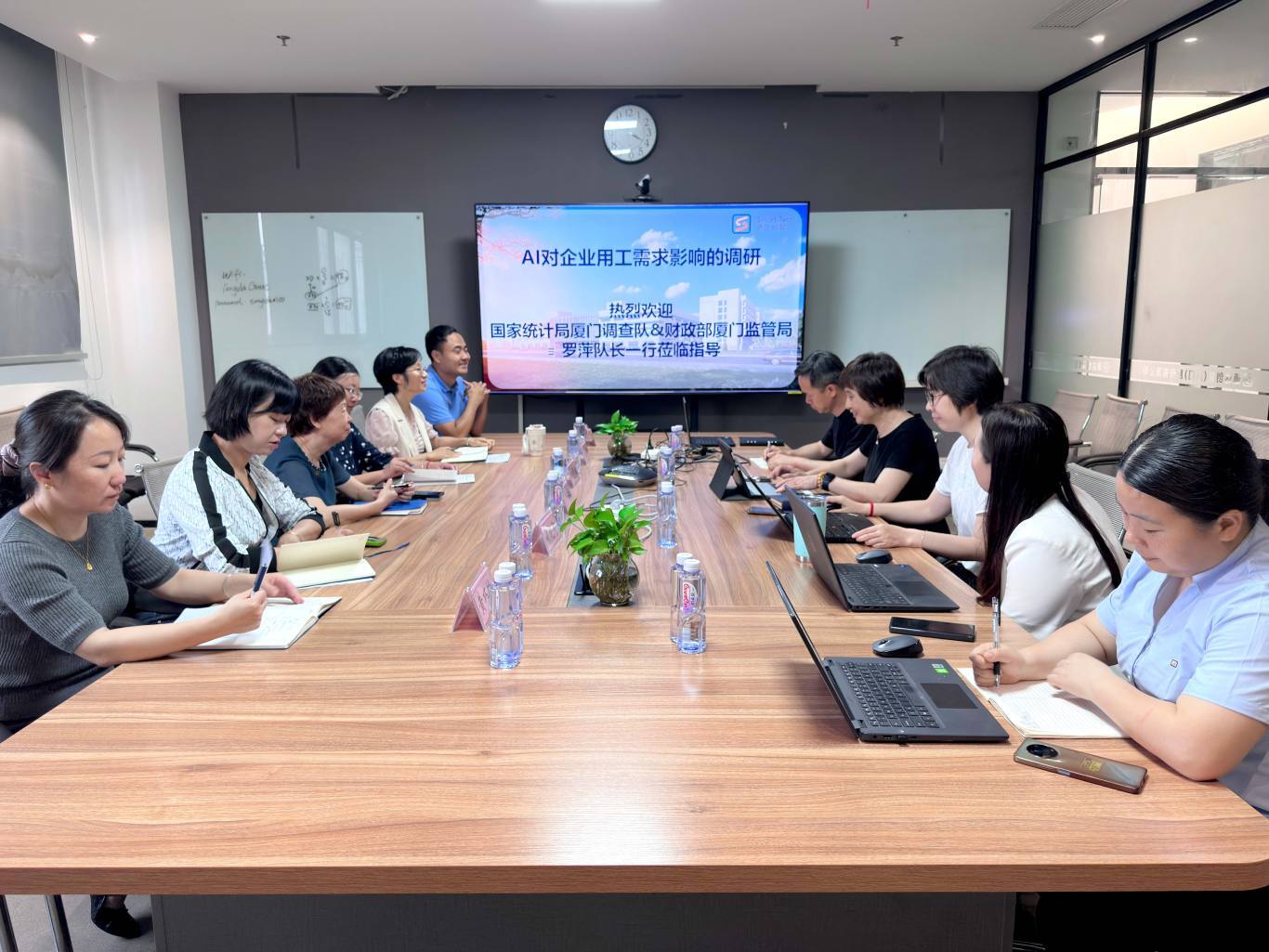 5月9日下午,国家统计局厦门调查队联合财政部厦门监管局组成专项调研组,由罗萍带队赴太阳集团tyc234cc开展"AI人工智能对企业用工需求影响"专题调研。太阳集团tyc234cc管理层高度重视此次活动,由公司企管中心总监郭松率人力资源部姜金凤部长、数字化部唐也为部长等管理人员参与调研活动。